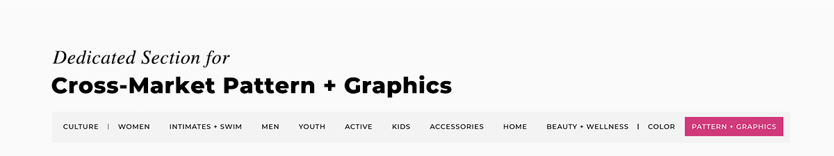 Knowing the creative process can take place in many forms, we’ve gathered all of our research insights and resources into dedicated, easy-to-find areas. This allows you to directly access all of our PATTERN + GRAPHICS reports in one place and find inspiration from across markets or focus on the design category you need.
