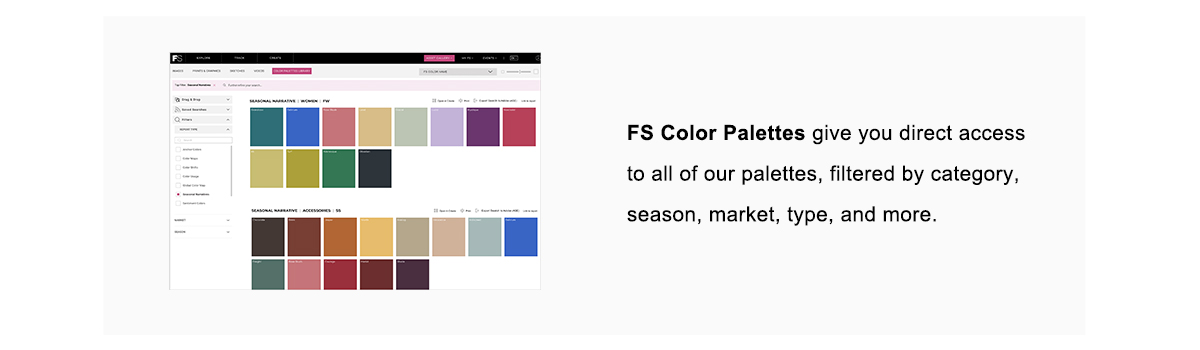 Color Palettes allow you to compare between seasons and markets easily and in one place, allowing access and tools to compare FS cross-market or cross-seasonal palette.